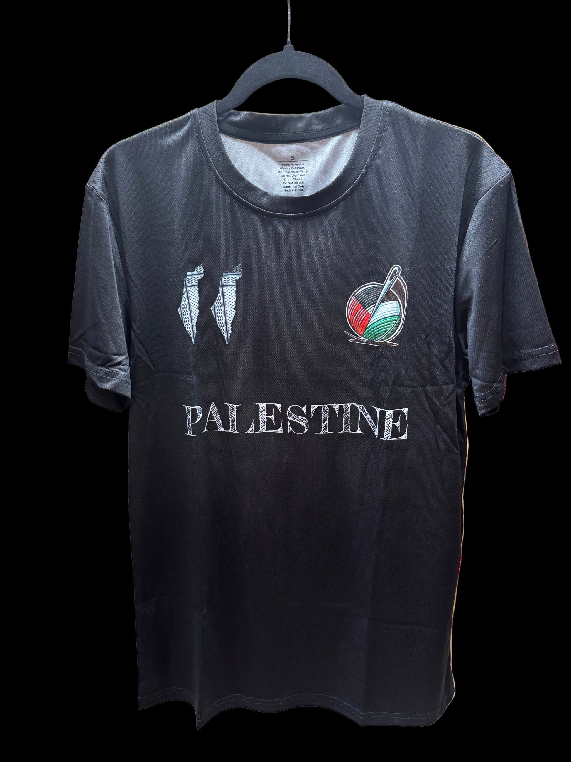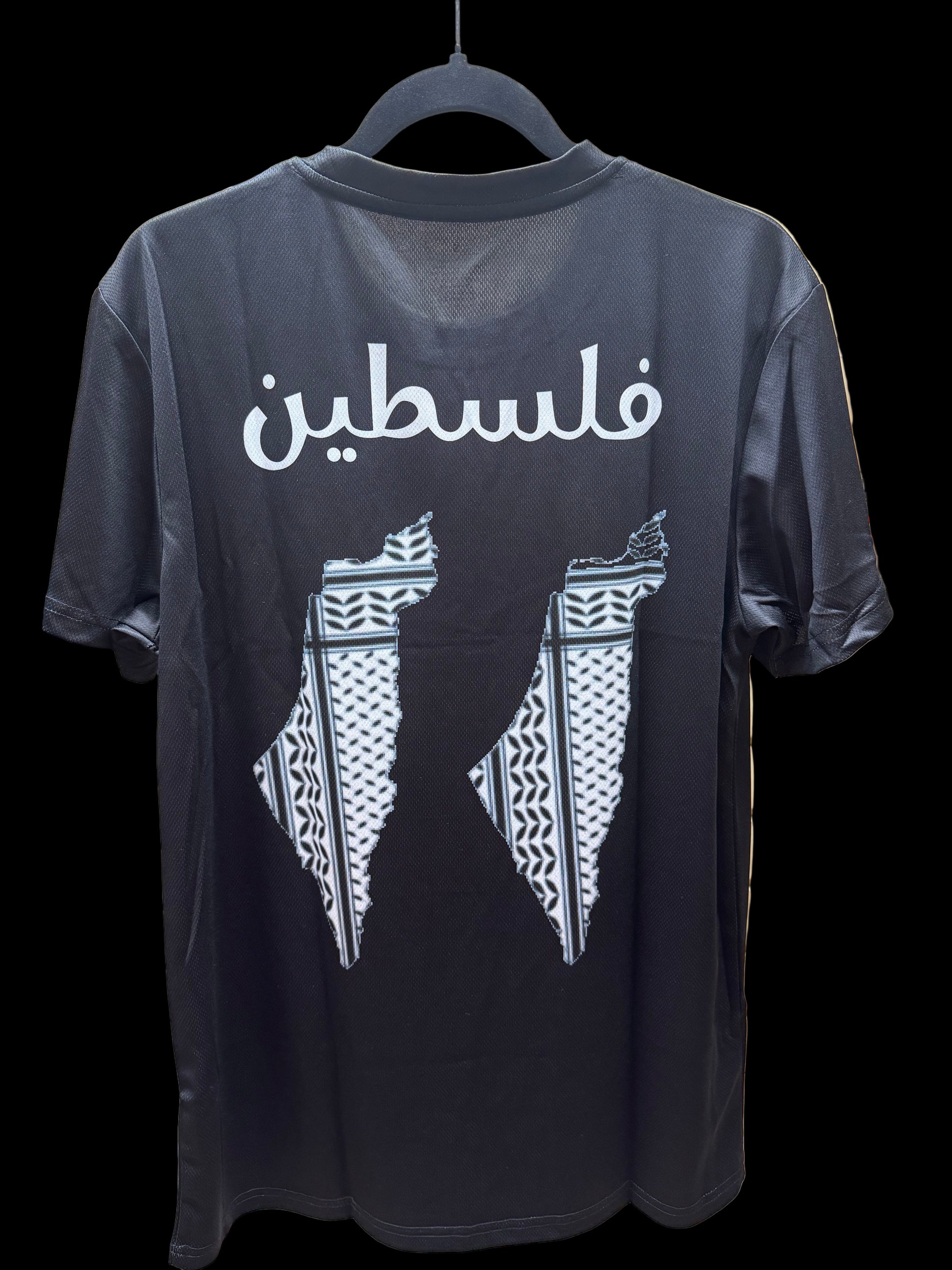 Sleek black Palestine jersey with a clean flag-inspired crest on the chest and “PALESTINE” across the front. Designed and customized in Palestine. Soft breathable fabric with a simple modern look.