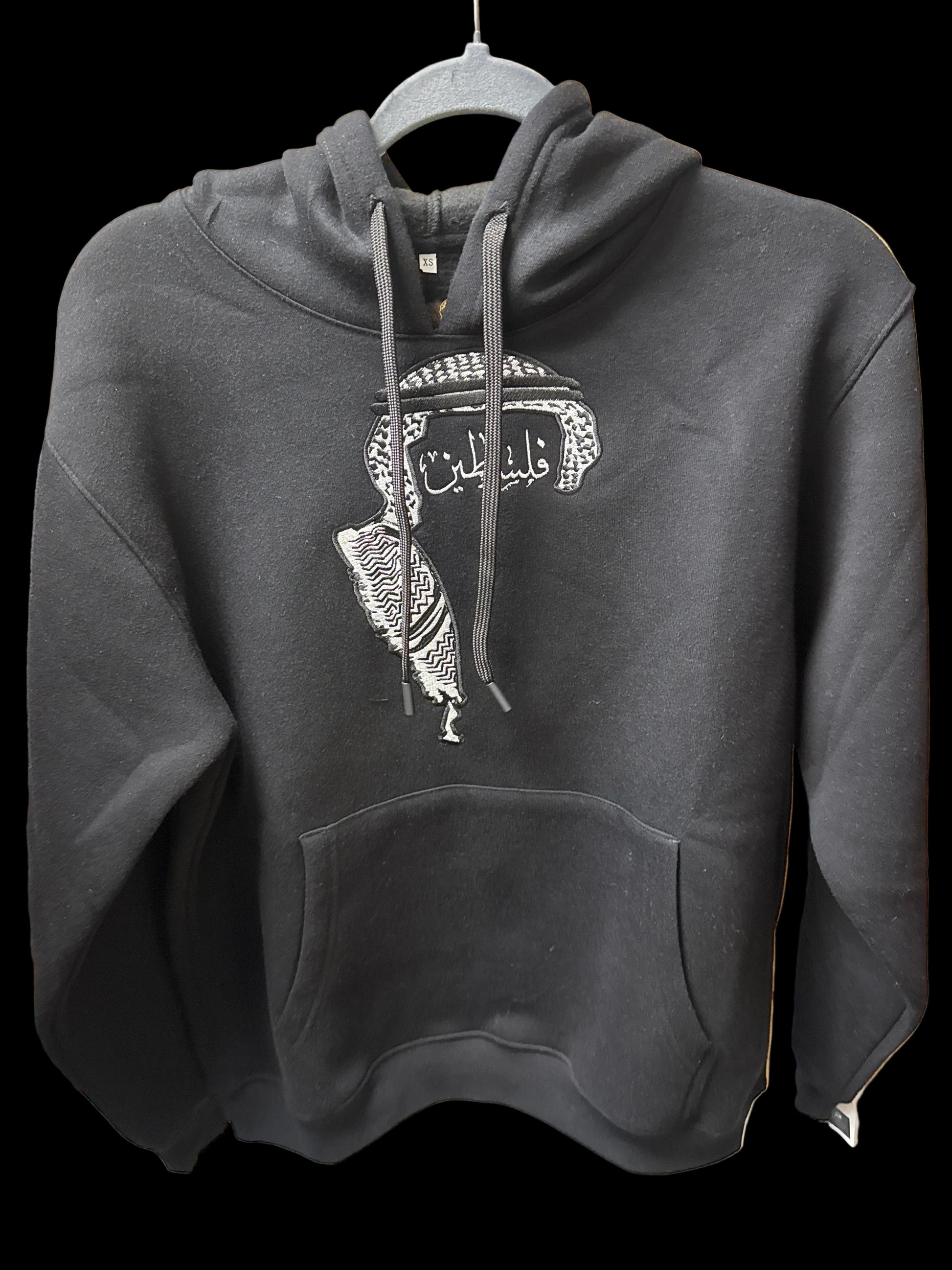 Experience the powerful message behind the Made in Palestine embroidered hoodie. Featuring a bold kuffiya design with the word "Palestine" emblazoned underneath, this hoodie represents the resilience and pride of the Palestinian people. Show your support and make a statement with this unique garment.