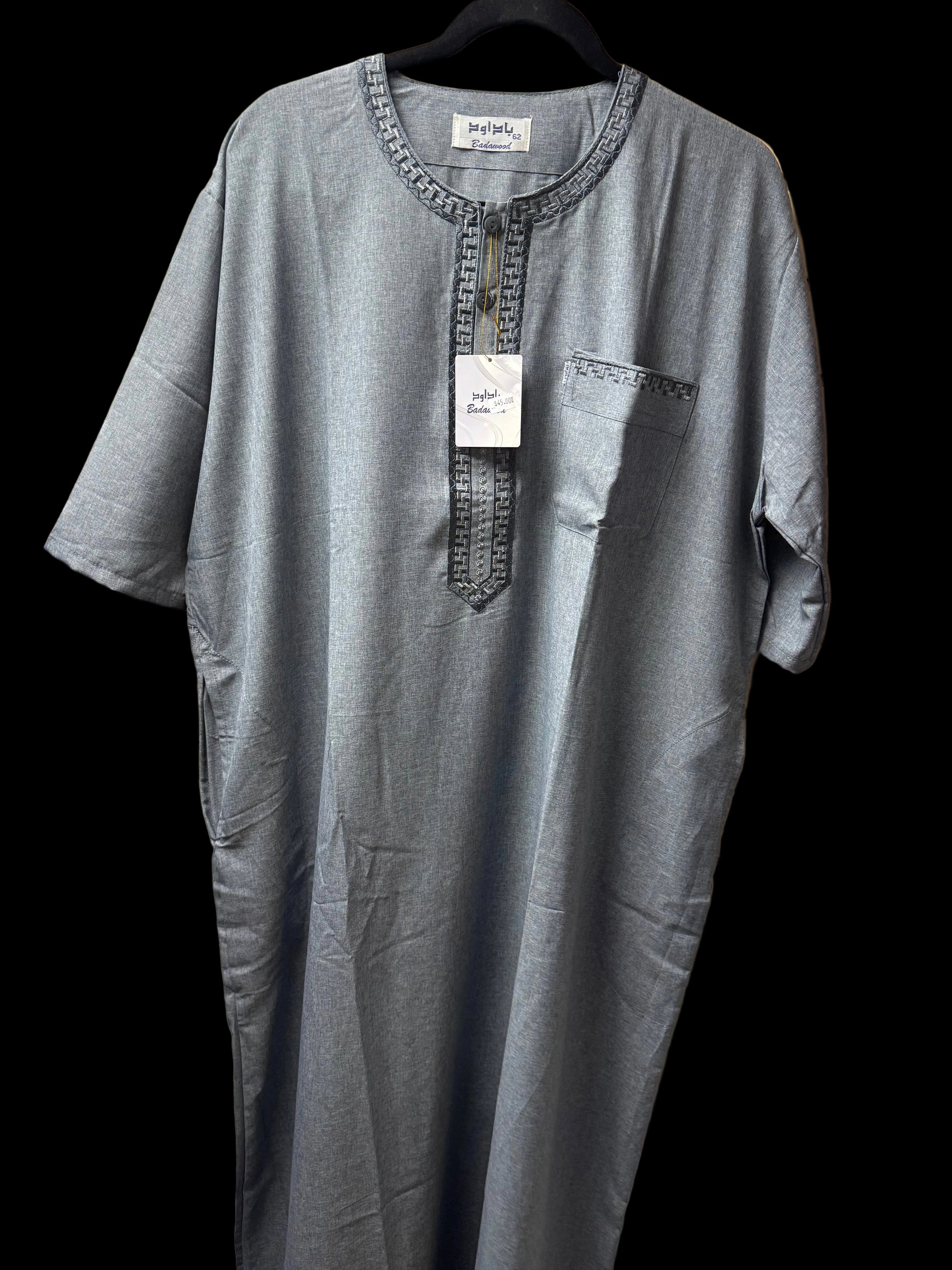 A classic Palestinian thobe in a soft grey tone, finished with subtle embroidered detailing at the neckline.